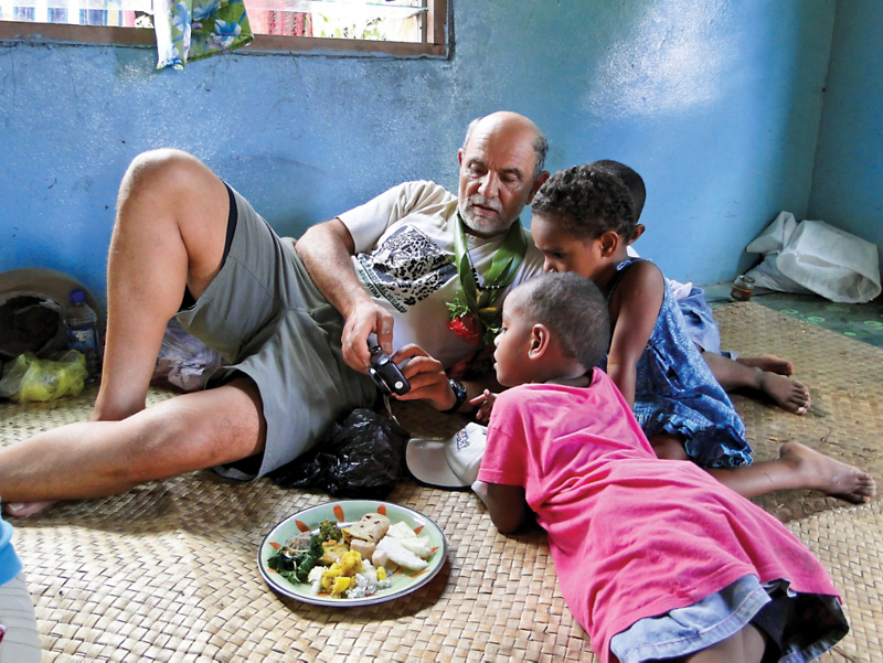 A Grand Circle traveler shares photos on his camera with local children during a Home-Hosted visit in Fiji during our Australia, New Zealand & Fiji vacation.