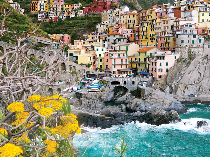 The colorful seaside village of Manarola, one of the five towns in the Cinque Terre, is seen from a walking trail during our Italy: Tuscany, the Alps & the Riviera vacation.