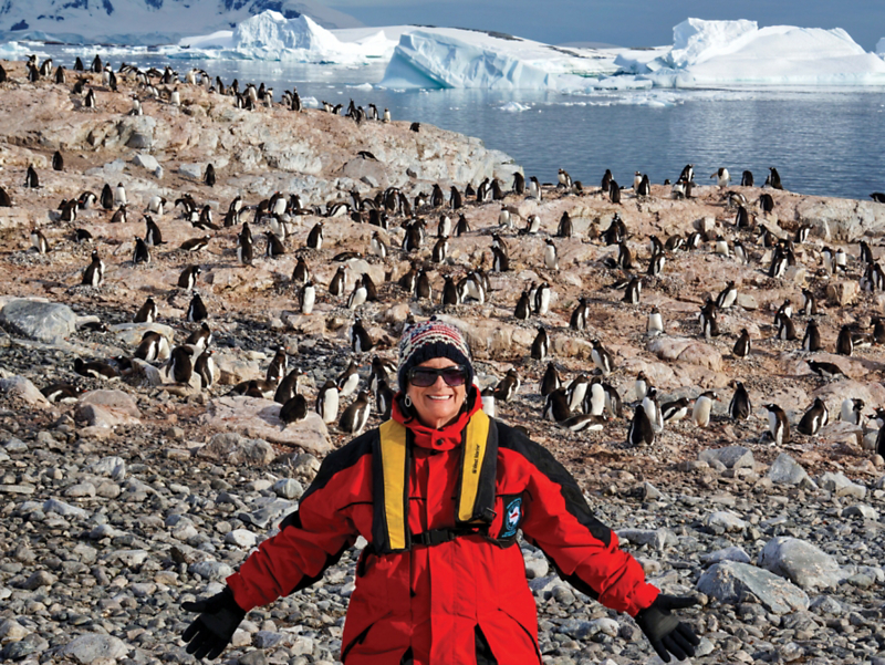 During Kimberly’s Antarctica’s White Wilderness cruise vacation, she shot this image of a fellow traveler amongst hundreds of penguins.