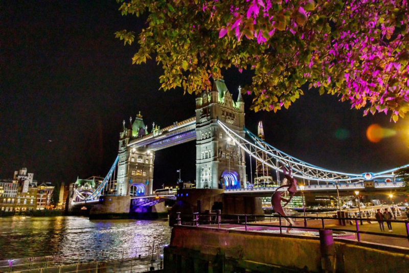 London’s Tower Bridge is illuminated in shades of purple during England, Scotland & Wales